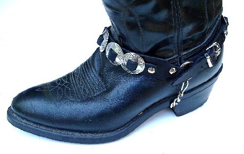 - 8 Nickel Conchos (four on front strap, four on backstrap) on Genuine Black Topgrain Leather Straps. Steel underchains for tight fit on any pair of western or biker boots.